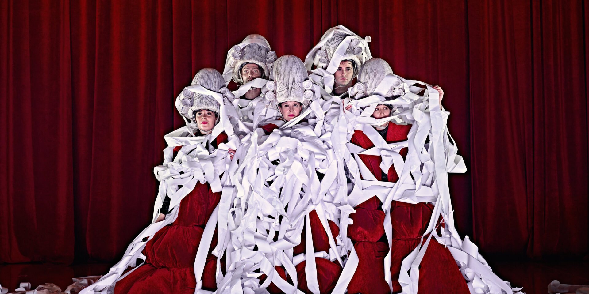 A striking number of performances and projects this year are about chaos. About when things don’t go the way they should, about misfortune, failure, falling … and getting up. This is no coincidence, because this year Cultura Nova’s program is an ode to resilience. Turning nothing into something. Of going on, trying again, figuring things out and being open to new opportunities, new ways. Qualities that make Heerlen and our region so special and resilient. But which children are also great at. That is what the opening performance of this festival, Mo et le Ruban Rouge by L’homme Debout, shows. The cover of this program booklet shows an image from the proposal. Mo, the child in this image, is huge and strong; the adult next to it is small and follows the gaze of the child seeking his new path. Or like the tragicomic figures of Danse Macabre. They fall outside the social norm. Despite setbacks and difficulties, they rise again and again and pull themselves together. With unusual solutions they find a place in a disrupted world.